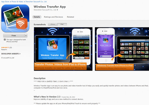 The iTunes Preview Link: https://itunes.apple.com/us/app/wireless-transfer-app/id543119010